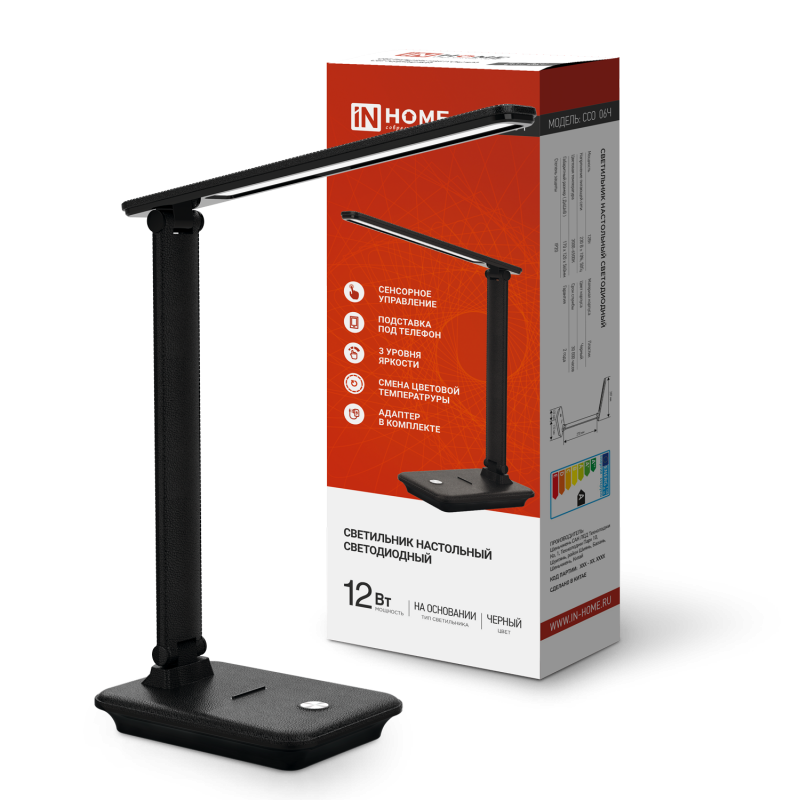 Светильник настольный светодиодный ССО 06Ч 12Вт 3000-6500К сенсор-диммер с подставкой под телефон черн. IN HOME